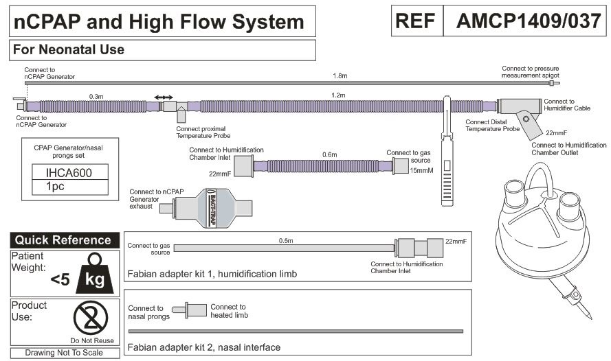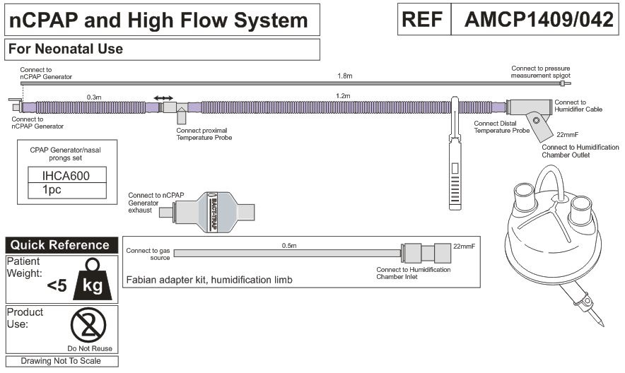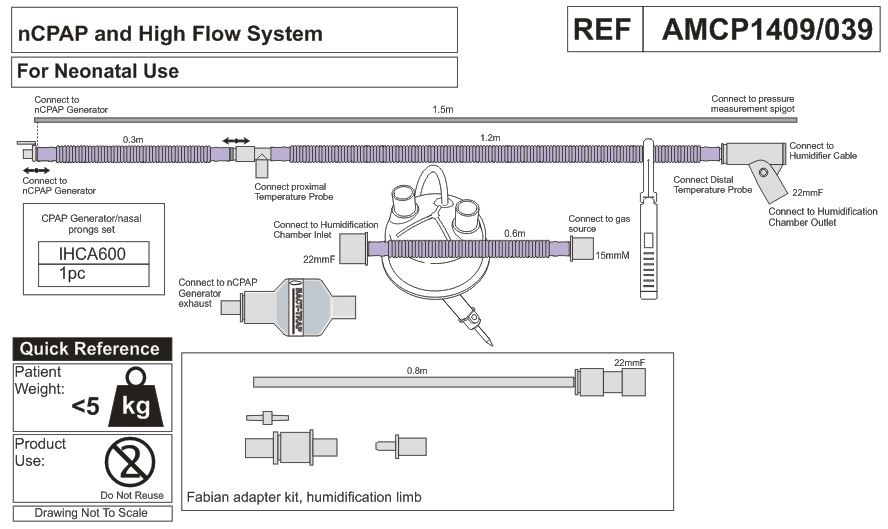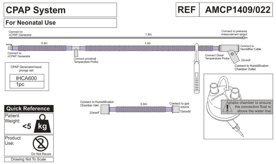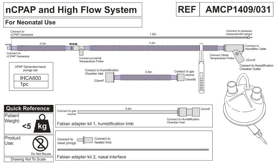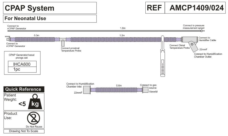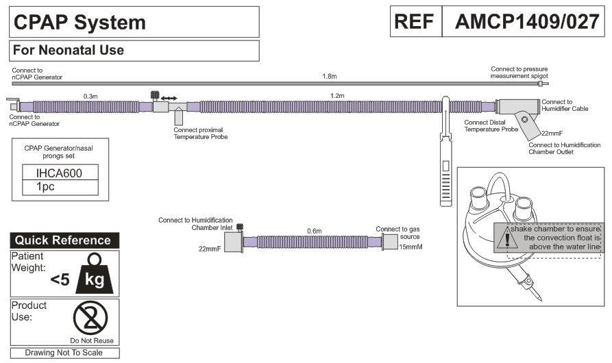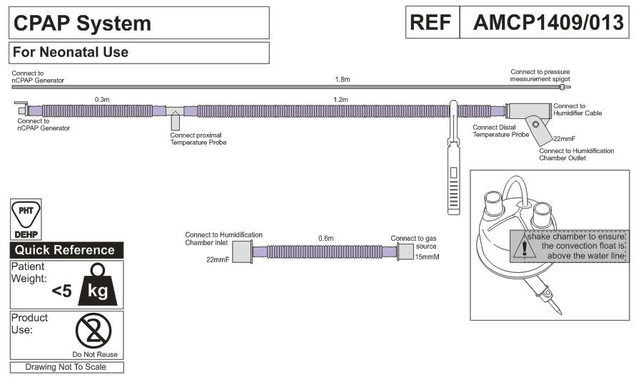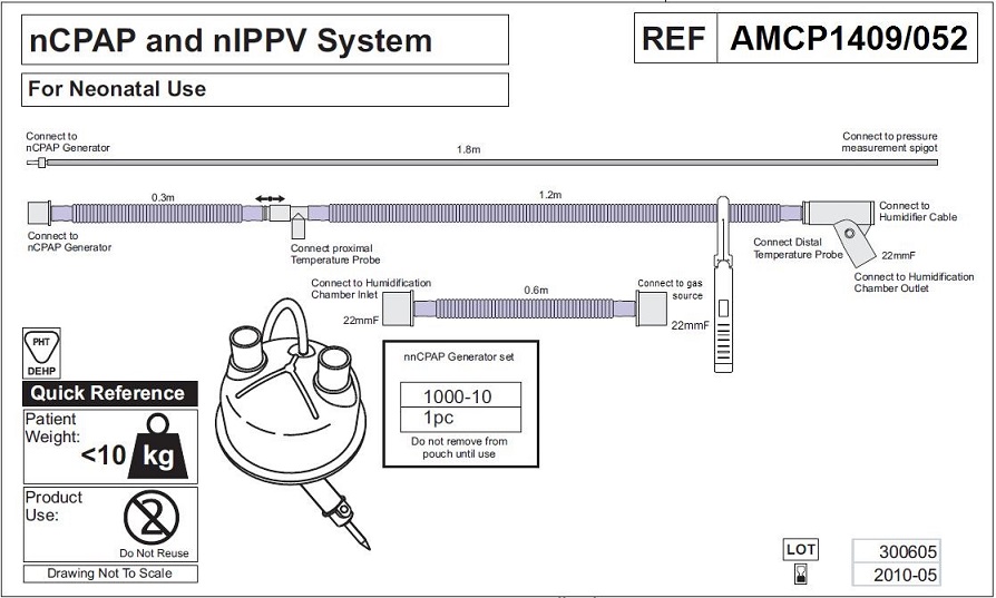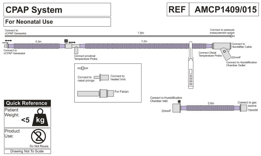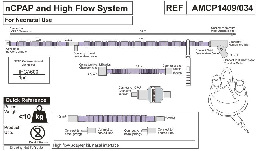 • линия вдоха обогреваемая (длина 1,2 м, диаметр 10 мм) с портом датчика температуры и коннектором (внутренний диаметр 22 мм), и трубкой-удлинителем (длина 0,3 м диаметр 10 мм) с коннектором для генератора nCPAP;